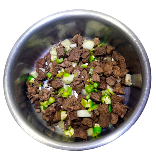 Coxão mole, bofe bovino, coração de boi, pepino e quiabo.