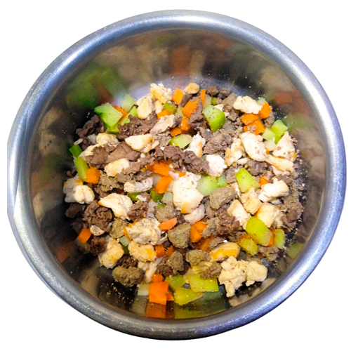Filé de frango, fígado de galinha, coração de galinha, cenoura e chuchu.