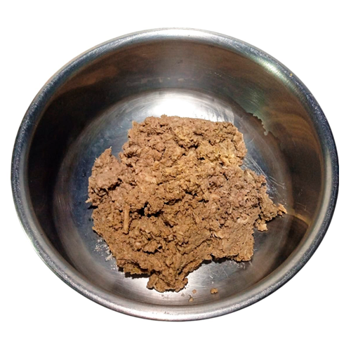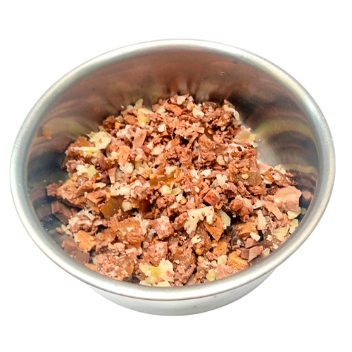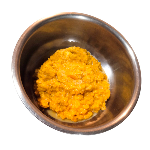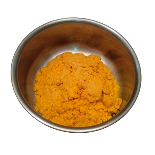 Peixe, bofe bovino, coração de galinha, abóbora e batata-doce roxa.